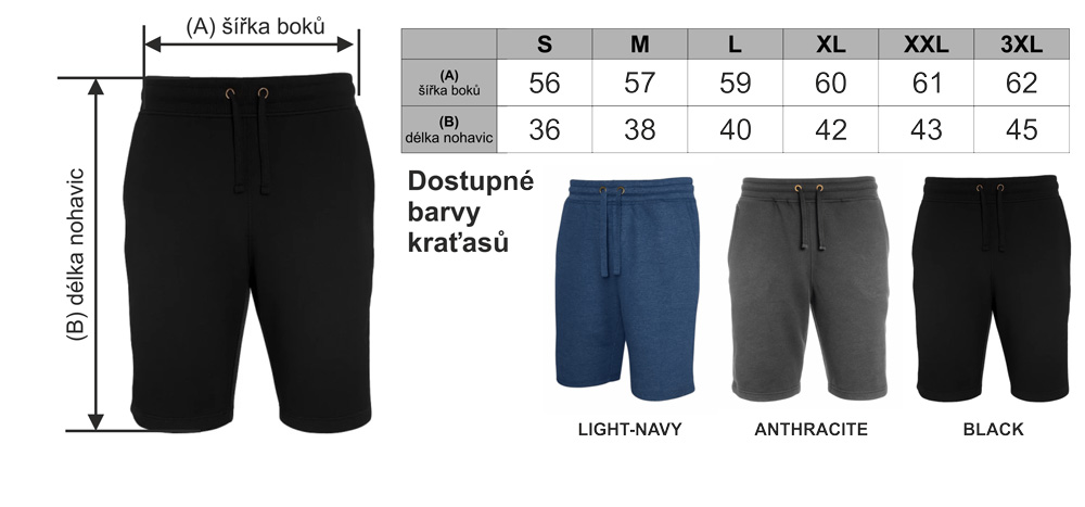 - Pánské teplákové kraťasy 280 g/m², 60% bavlna 40% polyester.