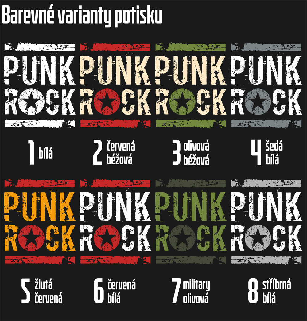 Punk tílka tiskneme na kvalitní textil vysoké gramáže. Punk motiv je z velice odolného a stálého materiálu, náhled na kvalitu a provedení potisku naleznete ZDE. Motiv vydrží mnoho praní a vypadá pořád jako nový.