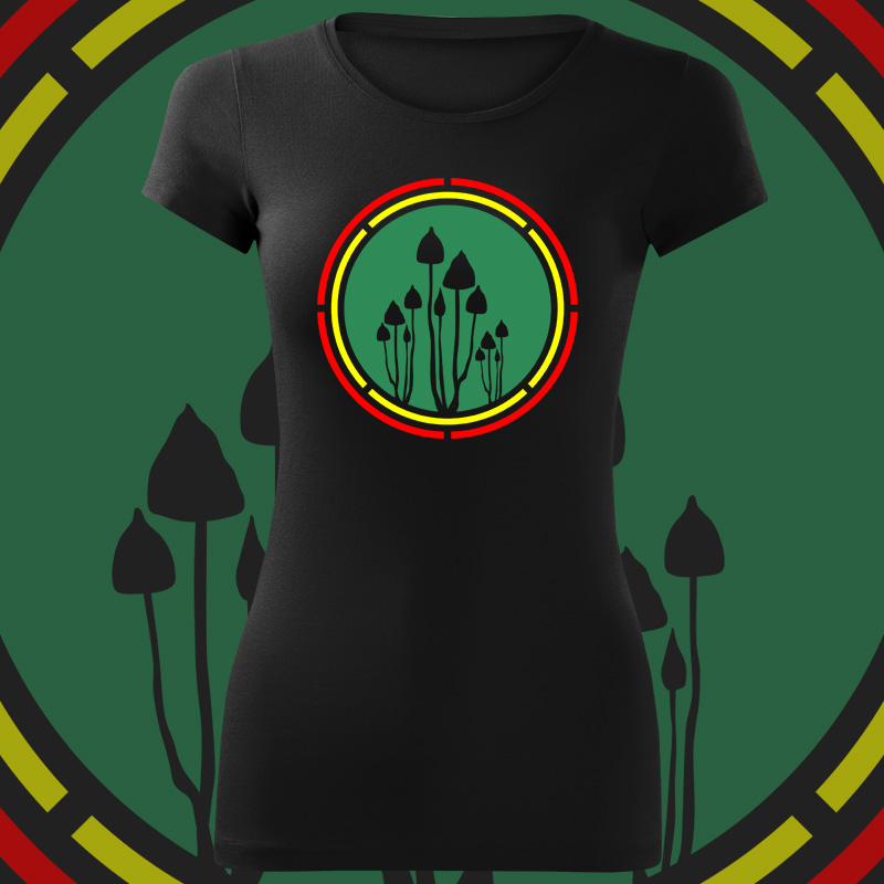 Tričko magic mushrooms dámské  Rasta reggae trička tiskneme na kvalitní textil vysoké gramáže. Rasta motiv je z velice odolného a stálého materiálu, motiv vydrží mnoho praní a vypadá pořád jako nový!  Velikosti: S, M, L, XL, XXL  Složení: 180 g/m², 95 % bavlna, 5 % elastan, Single Jersey, ... celý popis