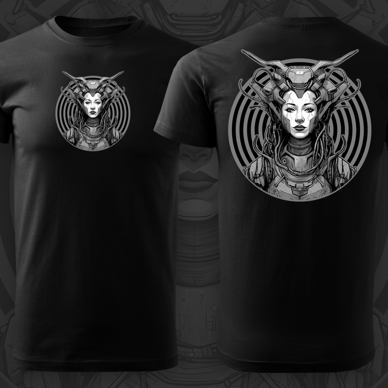 Trička tekno tiskneme na kvalitní textil vysoké gramáže. Tekno motiv Cyber woman je z velice odolného a stálého materiálu, motiv vydrží mnoho praní a vypadá pořád jako nový!